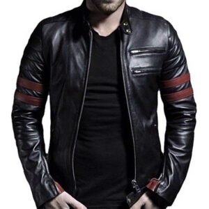 Men Black Leather Red Stripes Biker Jacket {Sale}