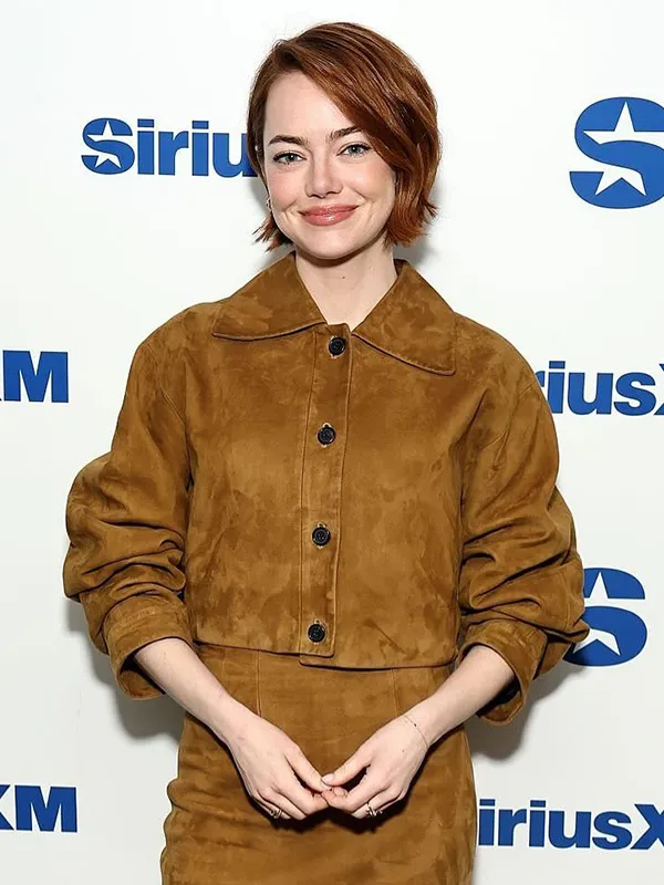 Re-Engineered Bugonia 2025 Michelle SiriusXM Town Hall Brown Suede Cropped Jacket