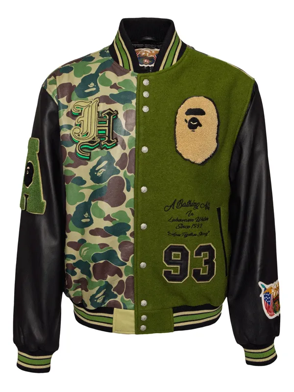 Jeff Hamilton Camo Wool and Leather Bomber Varsity Jacket