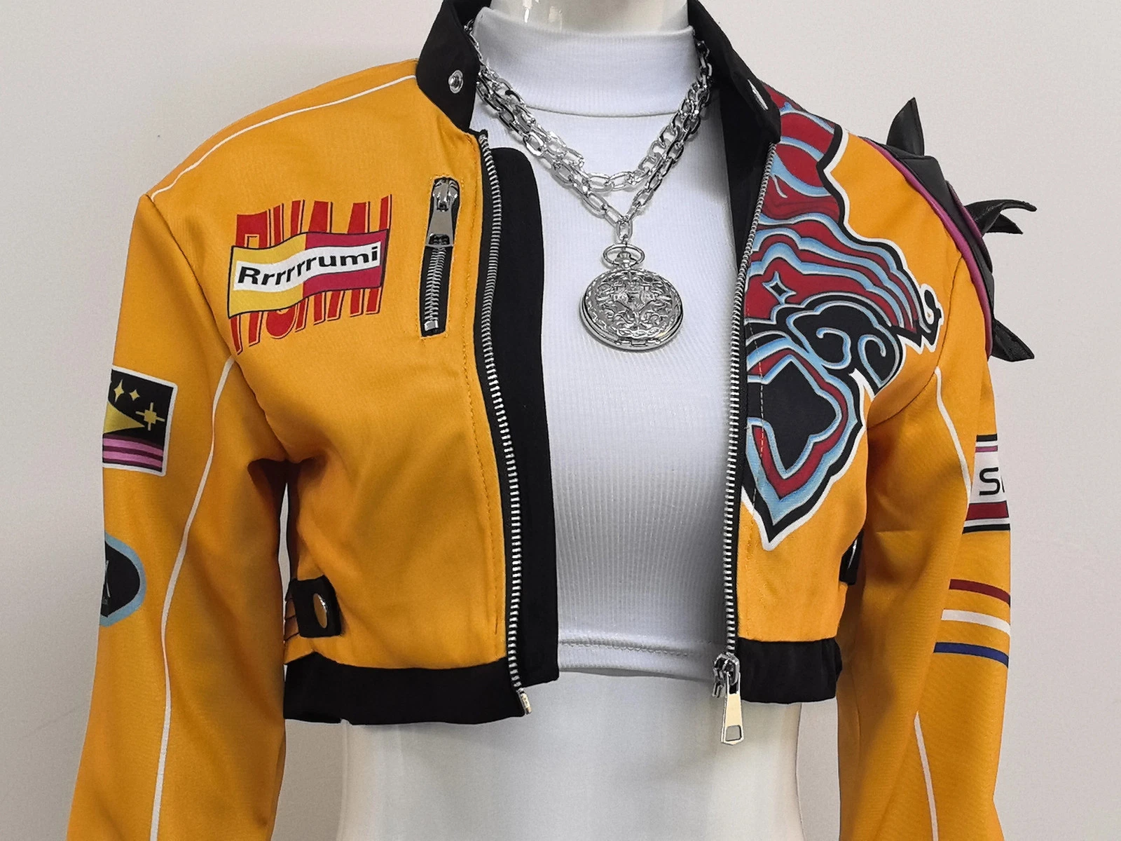 The front zipper closure ensures an elegant, moto-inspired silhouette. As well as the snap-tab collar that’s steeped in rebellious attitude. The cropped length of this jacket allows this jacket to easily be worn with high-waisted pants, skirts, or layers for casual wear. Distinct Rumi embellishments add character-driven styling and serve to represent the rebellious personality and attitude seen in the Demon Hunters universe.