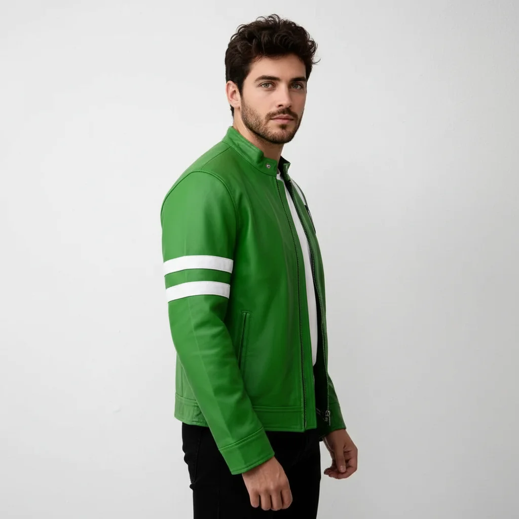 Channel your childhood hero with the Mens Alien Green Ben 10 Leather Jacket from San Francisco Jackets. Inspired by the legendary Cartoon Network series, this jacket is a perfect blend of nostalgia and modern fashion. Made from either real sheepskin leather or 100% vegan leather, it offers both durability and comfort. The stand-up snap-tab collar, zippered cuffs, and Ben 10 logo on the chest capture the spirit of the show with an authentic flair. Whether you’re heading to a cosplay event, comic convention, or just want to show your love for Ben 10, this jacket will make you stand out in heroic style.