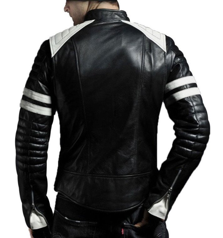 Men’s Leather Biker Jacket White Stripes On Sleeves