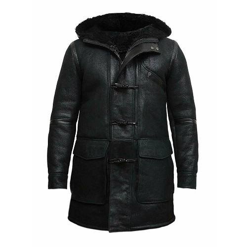 Men’s Leather Duffle Coat Fur Hood In Black