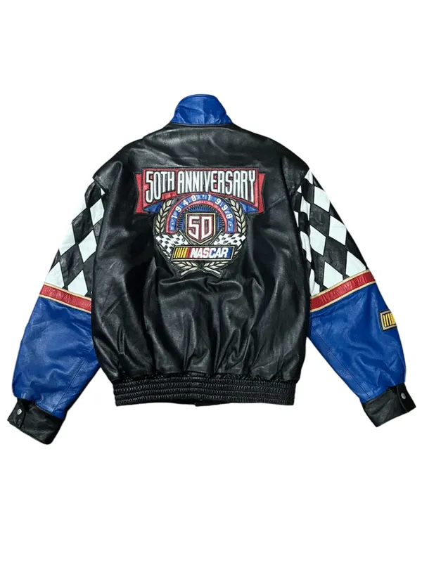 This is the NASCAR 50th Anniversary Racing Leather Jacket, a piece that encapsulates a significant milestone in the history of NASCAR. Besides, doing business San Francisco Jackets, they are presenting to you this legendary piece of clothing with a vintage touch redesigned to match the latest trends.