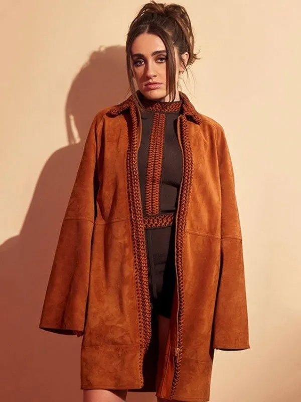 Re-engineeered | Bottoms 2023 Rachel Sennott Brown Suede Leather Coat – A stylish brown suede leather coat inspired by Rachel Sennott’s look, offering a chic, modern vibe with timeless elegance.