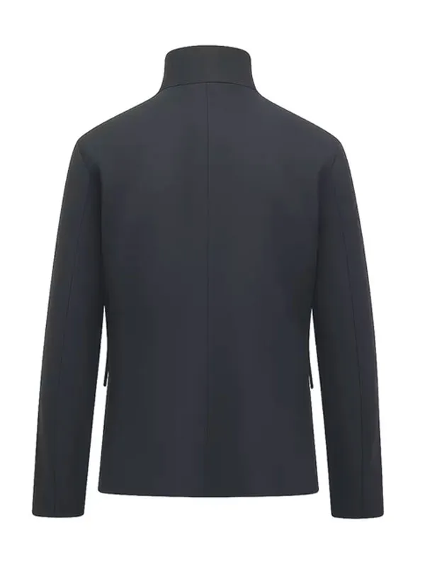 Front buttoned closure paired with a modern stand-up collar