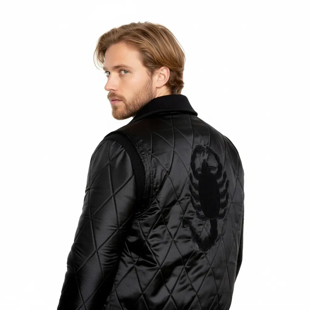 Inspired by Ryan Gosling’s Drive (2011), the Blackout Drive Scorpion Jacket reimagines the iconic movie look in sleek black satin. With its signature scorpion design on the back, soft viscose lining, and handcrafted precision, this bomber jacket delivers timeless style, comfort, and bold confidence for any occasion.